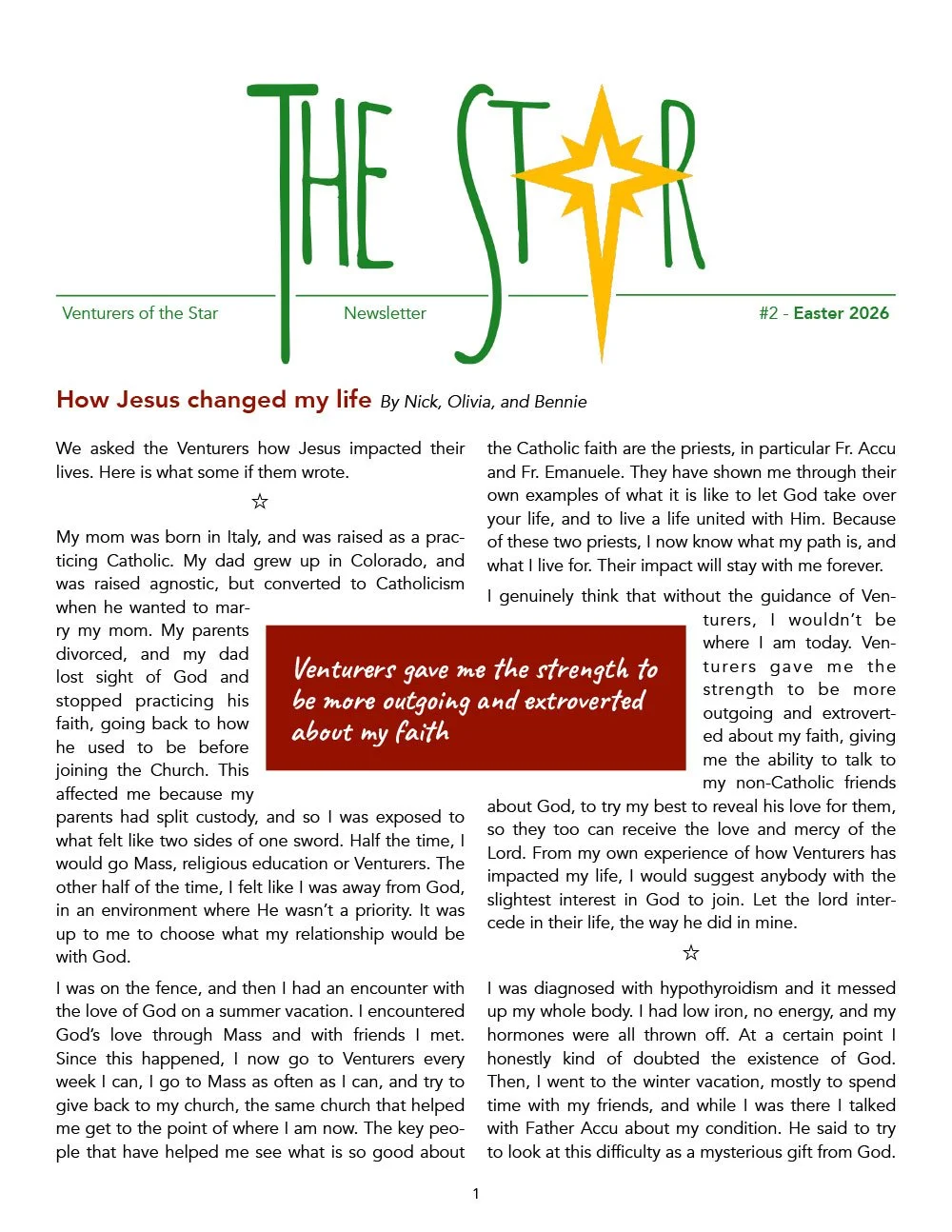 Venturers is our middle school youth group, led by Fr. Accu and affiliated with Communion and Liberation. All sixth through eighth graders are invited to join us weekly throughout the school year to play games, sing songs, and share our lives together. Venturers offers middle school students a beautiful opportunity to take their faith seriously and learn to recognize God’s presence in every moment of their lives.
